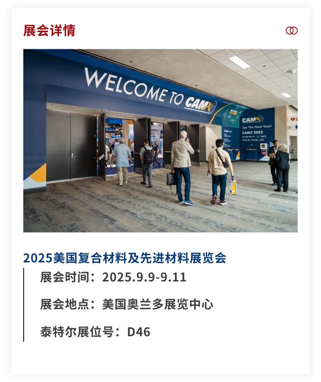 2025美国复合材料及先进材料展览会 (CAMX 2025),将于9月9日至11日在美国奥兰多展览中心盛大举行。泰特尔诚邀全球合作伙伴莅临展位,共探复合材料市场的创新与机遇!